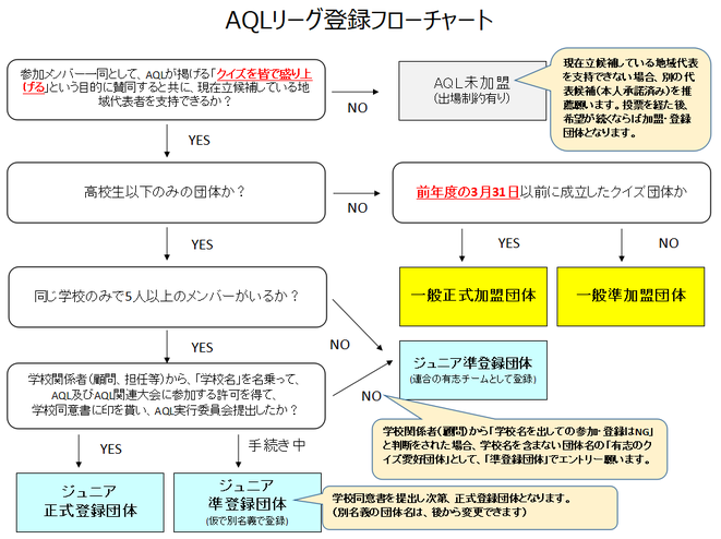 *原則、前年度以前に何らか成立した上で活動したエビデンス(活動実態を示す公式サイトやTwitterの存在、新・一心精進で告知されるなどした公的なクイズ団体戦への参加)を必要とする。(前年度の『AQL』に適切に出場したチームは、原則正式加盟となる)